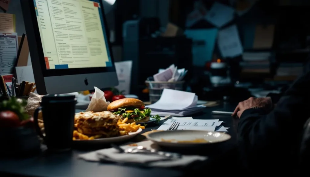 - 🍔 תזונה פחות בריאה: אכילה ליד שולחן העבודה עלולה לגרום לבחירות תזונתיות בלתי נכונות, כמו נשנושים לא בריאים.